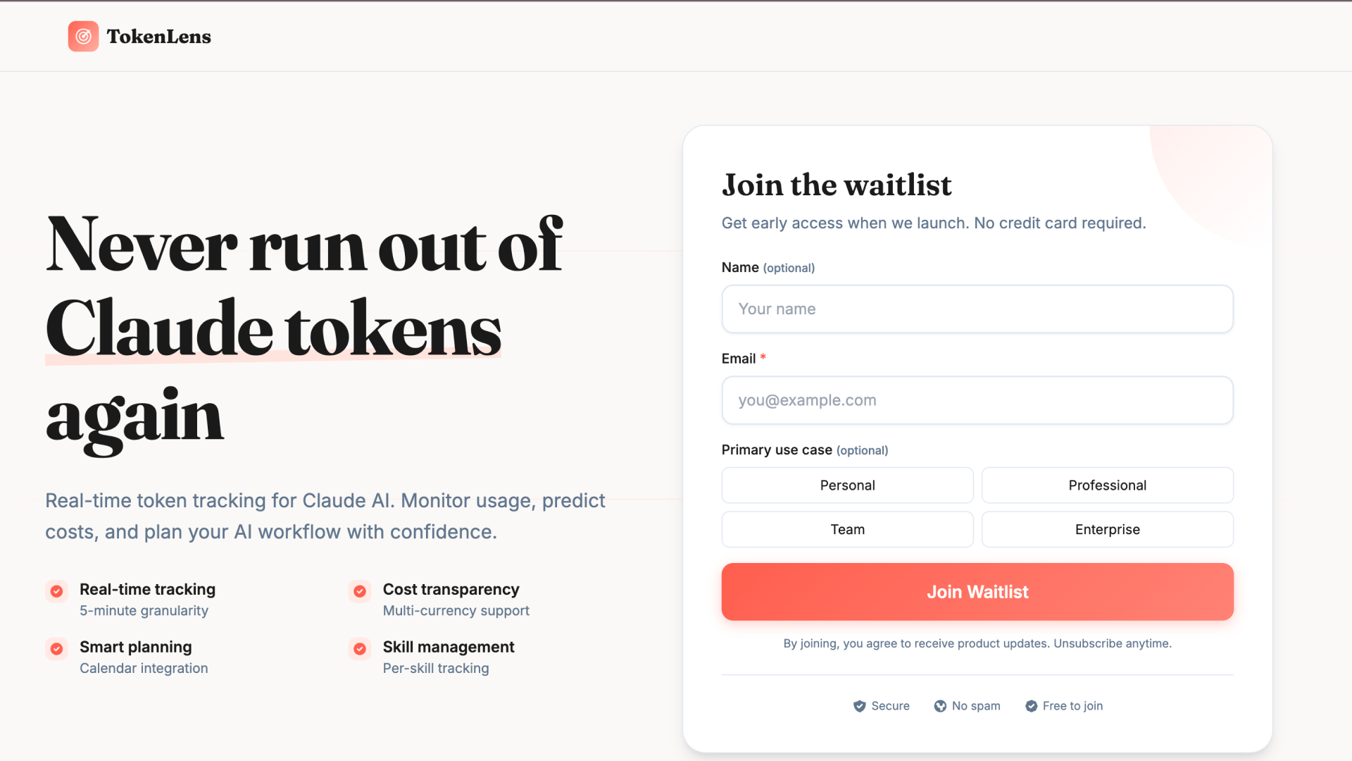 Exactly one H1 found: "Never run out ofClaude tokensagain".